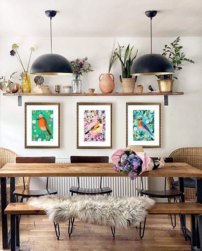 Cuadro de lámina de pajarito azul con fondo de flores, paspartú blanco y marco perla oro.