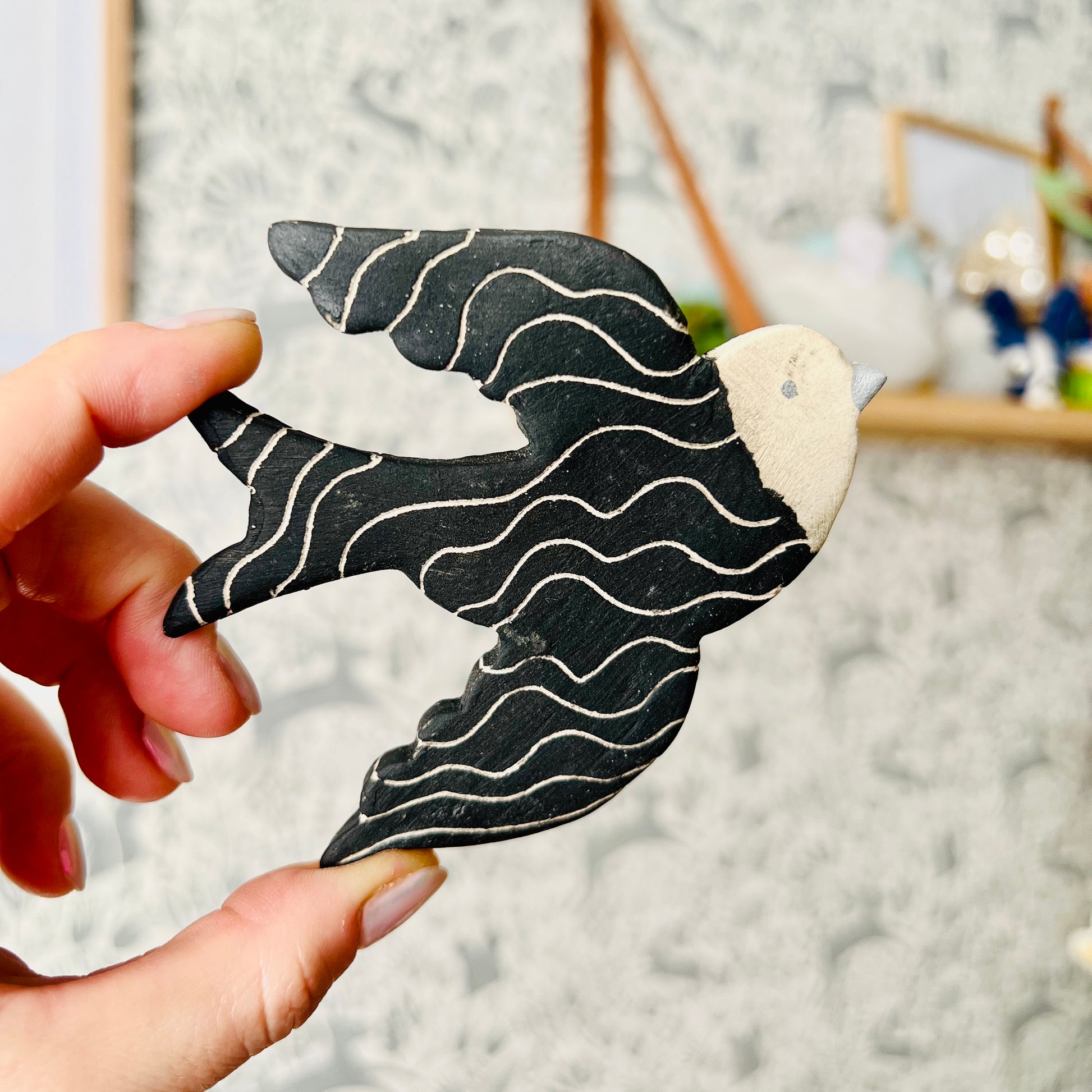 Pajarito hecho en cerámica gres, esmaltado con engobe negro y esmalte mate con texturas en blanco.