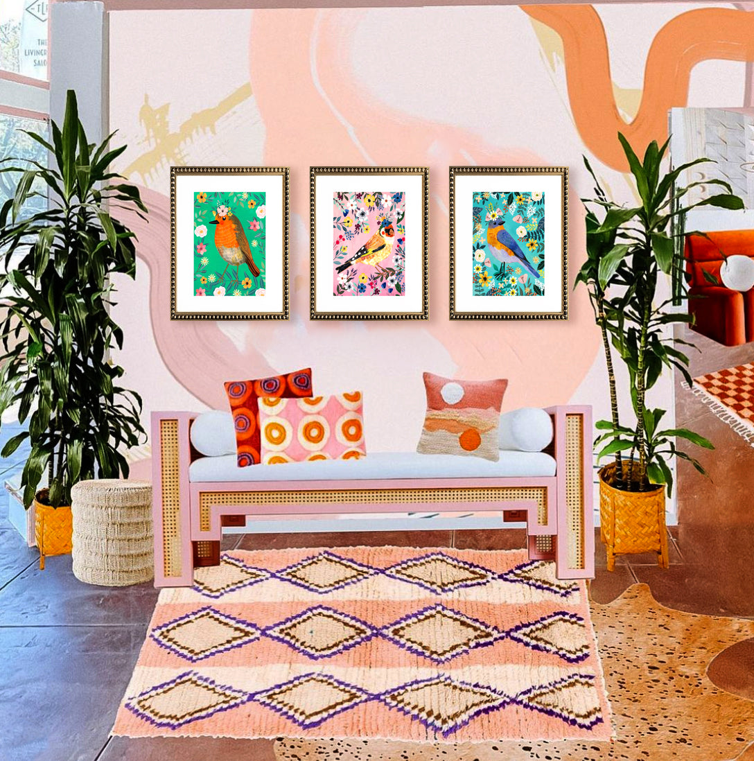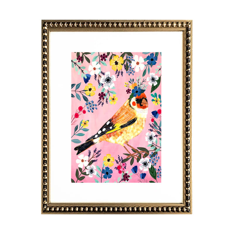 Cuadro de pajarito con flores en fondo rosa, paspartú blanco y marco de madera con perlas color dorado envejecido.