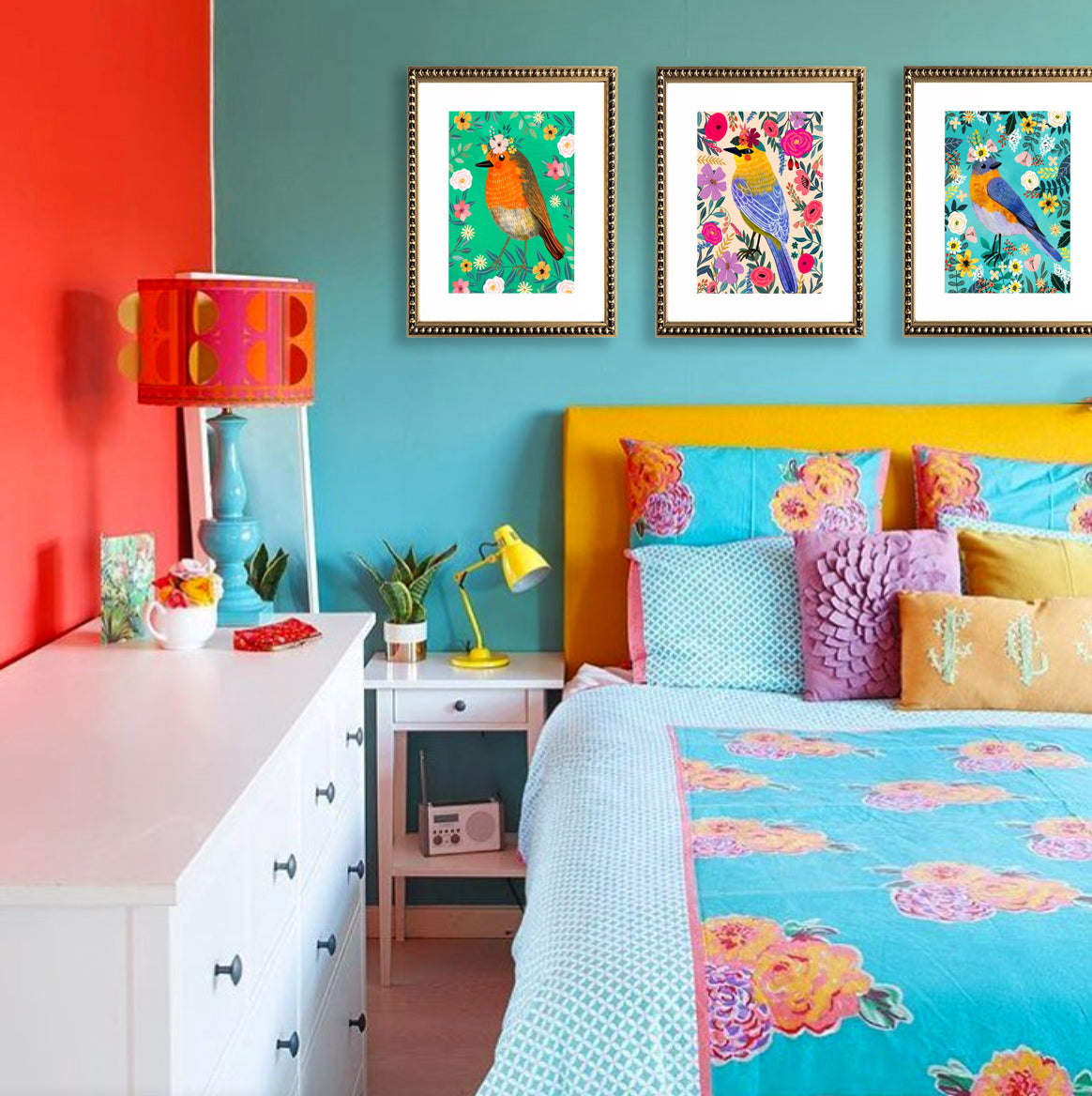 Cuadro de pajarito con flores en fondo verde, paspartú blanco y marco de madera con perlas color dorado envejecido.