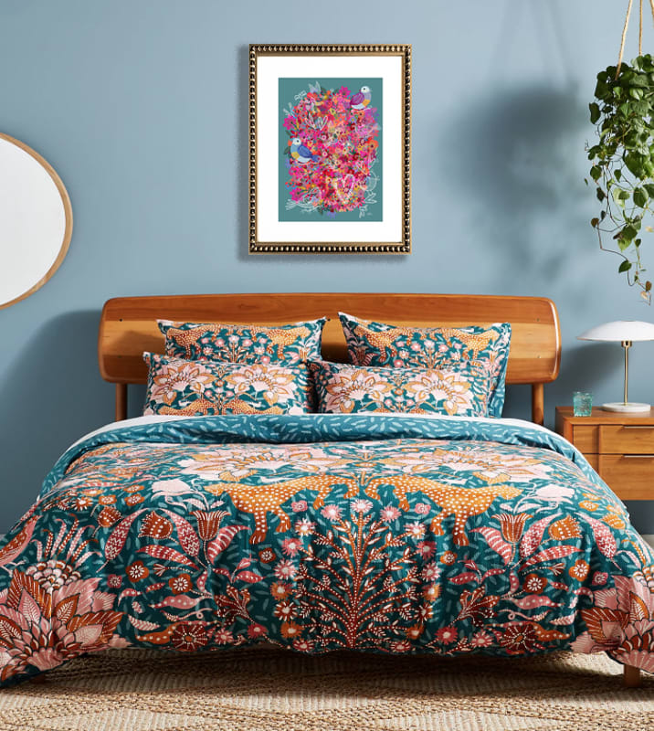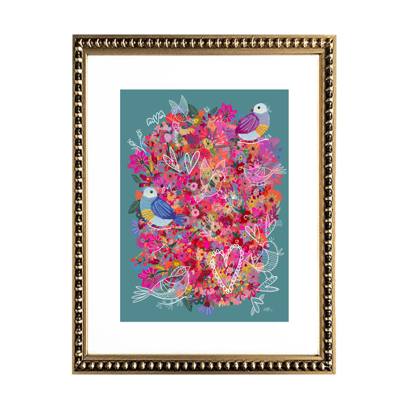 Cuadro de ilustración digital de flores en colores con pajaritos en blanco, paspartú y marco de madera perla oro.