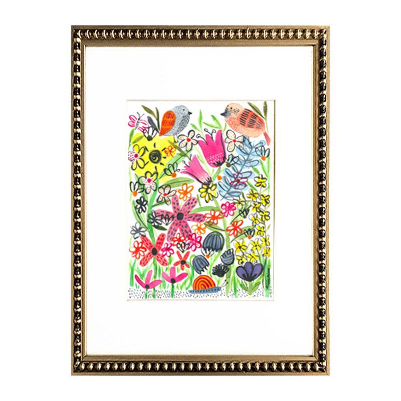 Cuadro reproducción en acuarela de pajaritos en jardín, paspartú blanco y marco perla dorado.