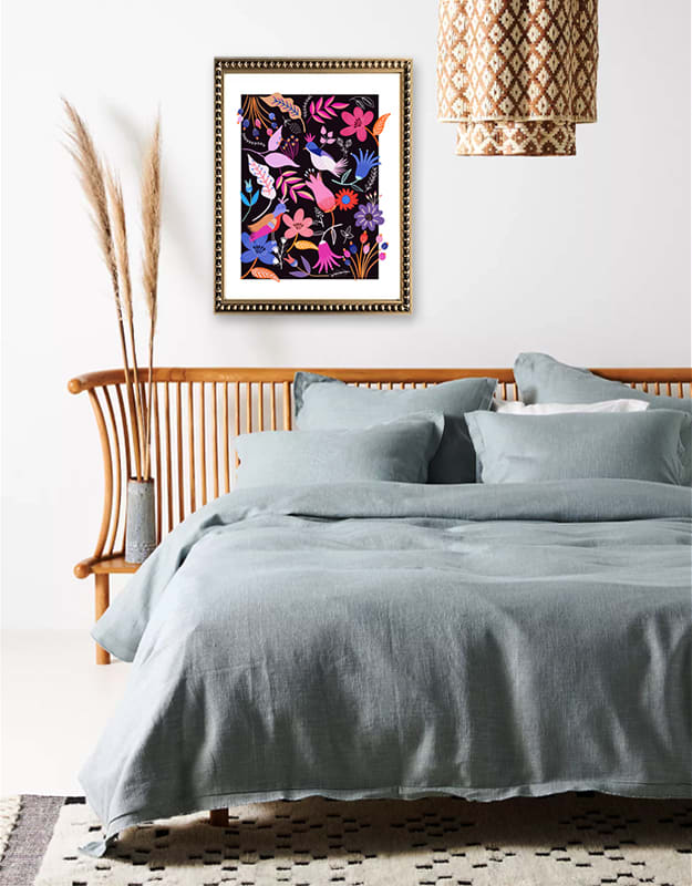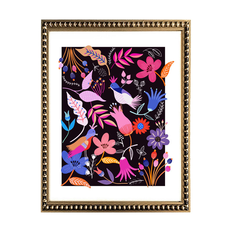 Cuadro de ilustración digital en colores fucsia y fondo negro, paspartú blanco y marco perla oro.
