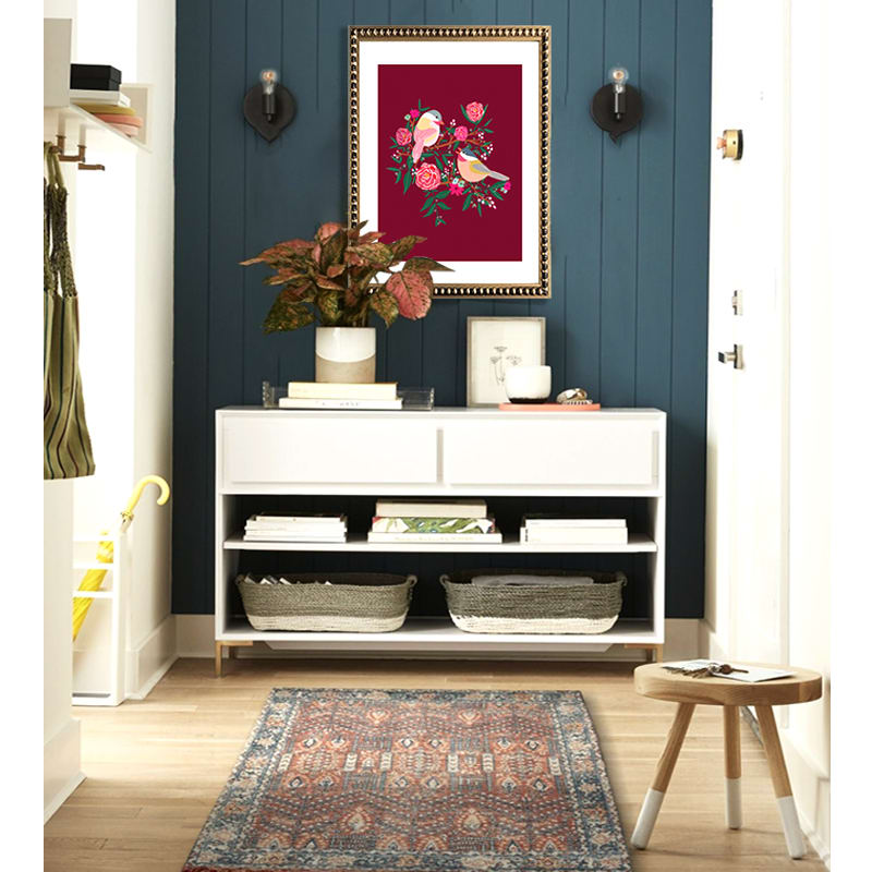 Cuadro de ilustración digital de pajaritos en rama con flores y fondo burdeo con detalles en color. Paspartú blanco y marco de madera con perlas dorado.