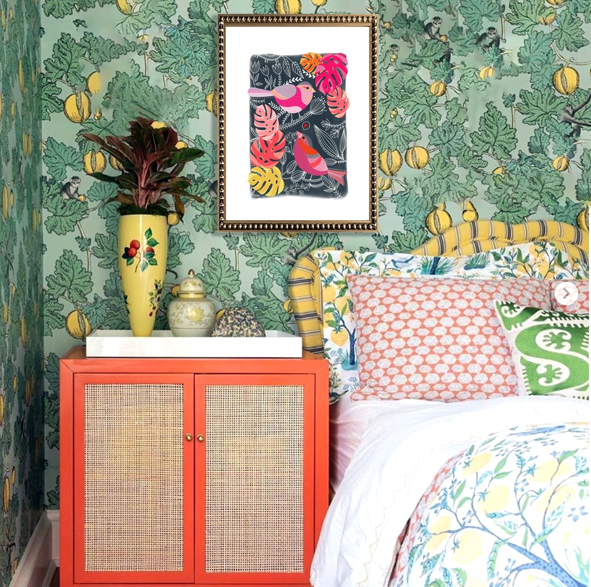 Cuadro de ilustración digital de pajaritos rosa y rojo en fondo gris con detalles en lápiz blanco. Paspartú blanco y marco de madera con perlas dorado.