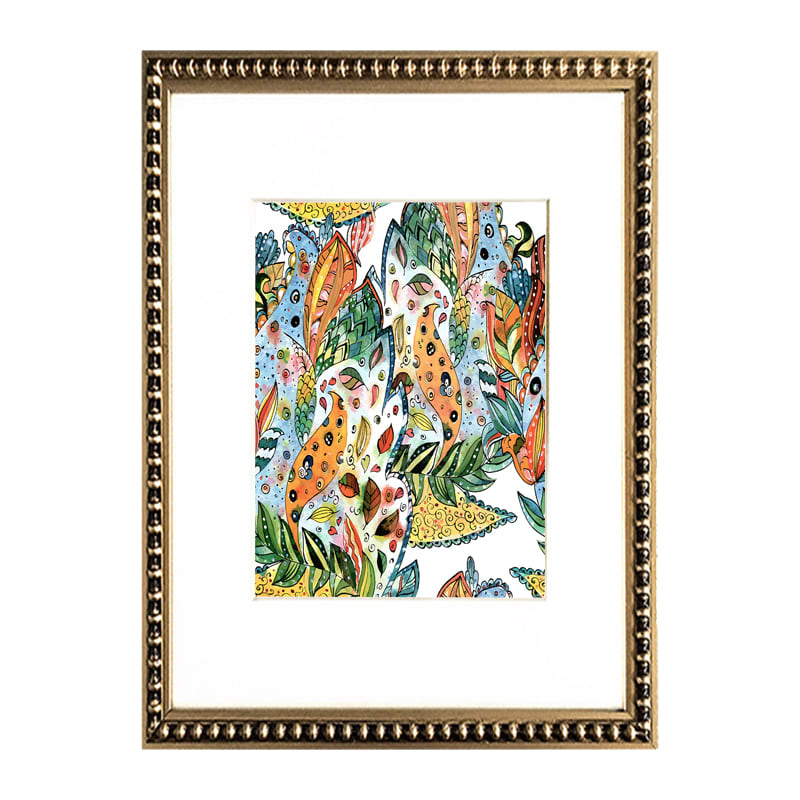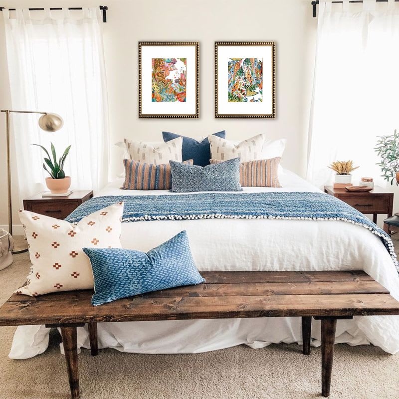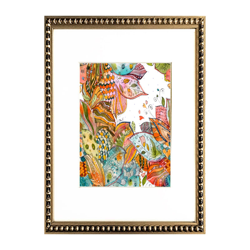 Pareja de cuadros con diseño abstracto en colores, paspartú blanco y marco de perlas delgado.