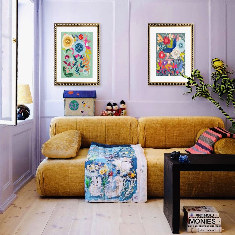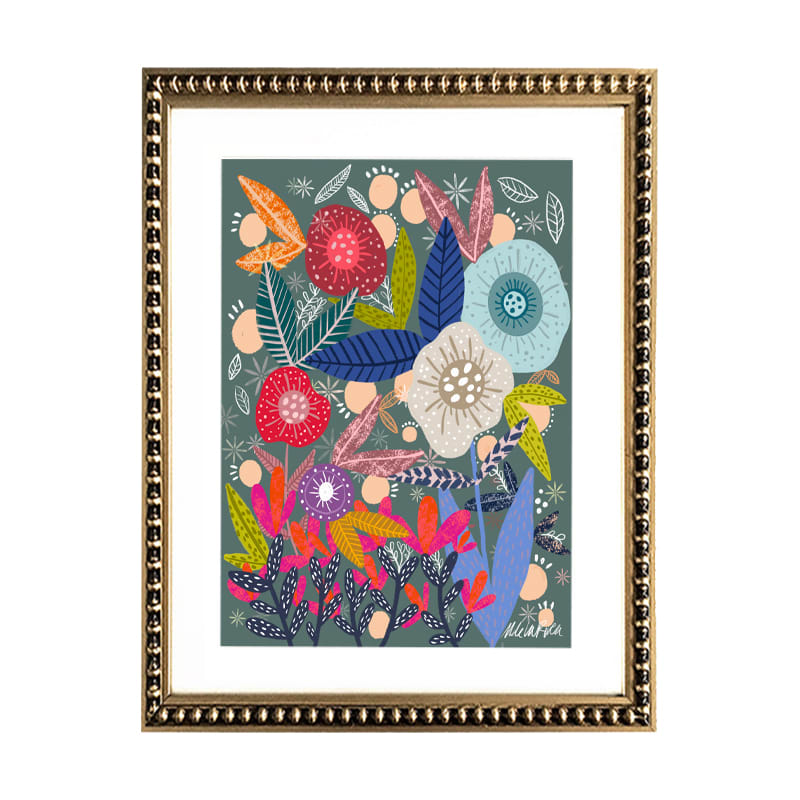 Pareja de cuadros con diseños de flores en colores, paspartú blanco y marco de madera con perlas color dorado envejecido.
