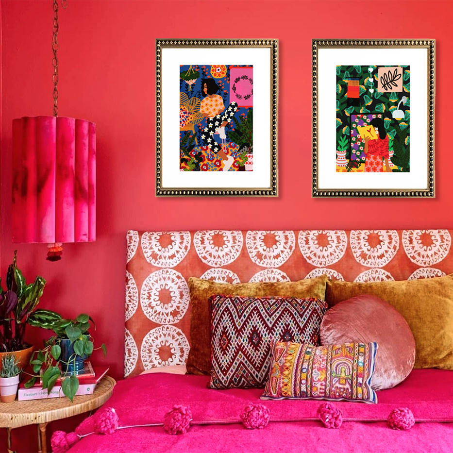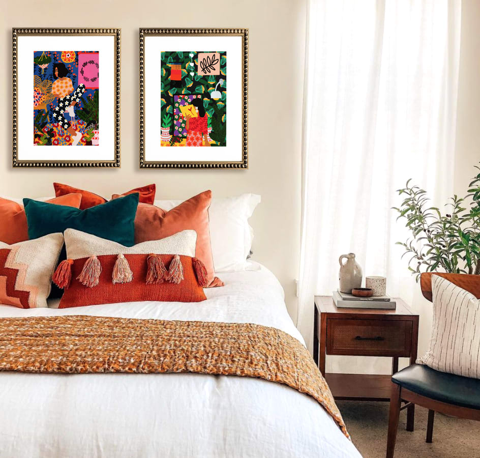 Pareja de 2 cuadros de diseños de mujeres en color, con paspartú blanco y marco de madera con perlas dorado.