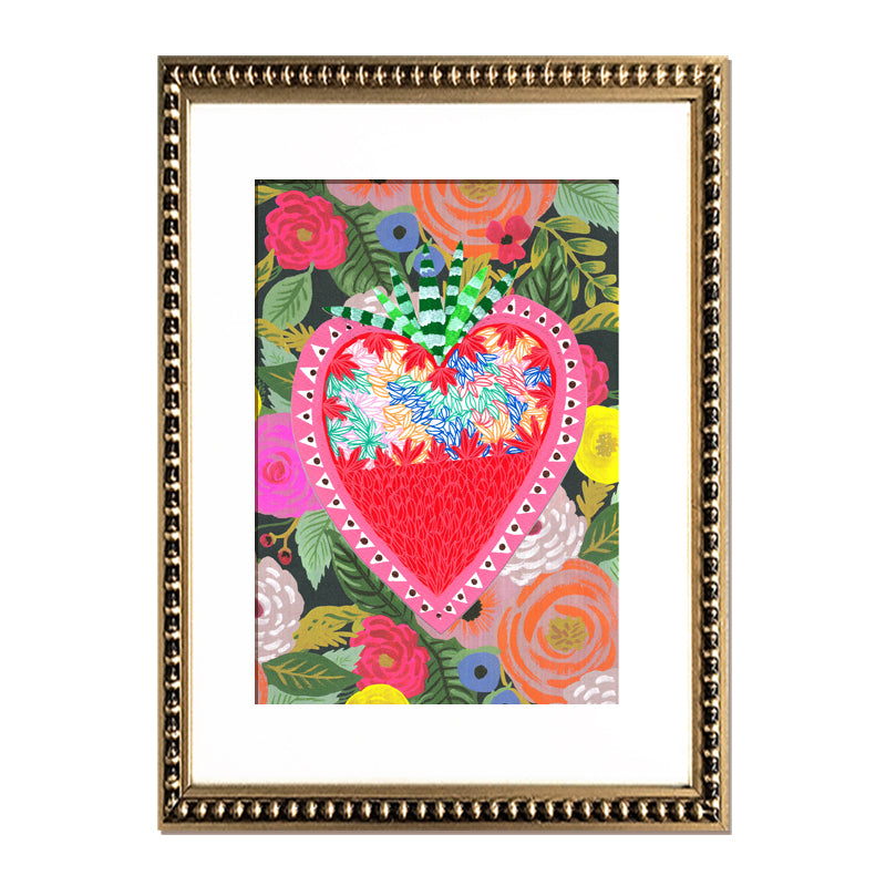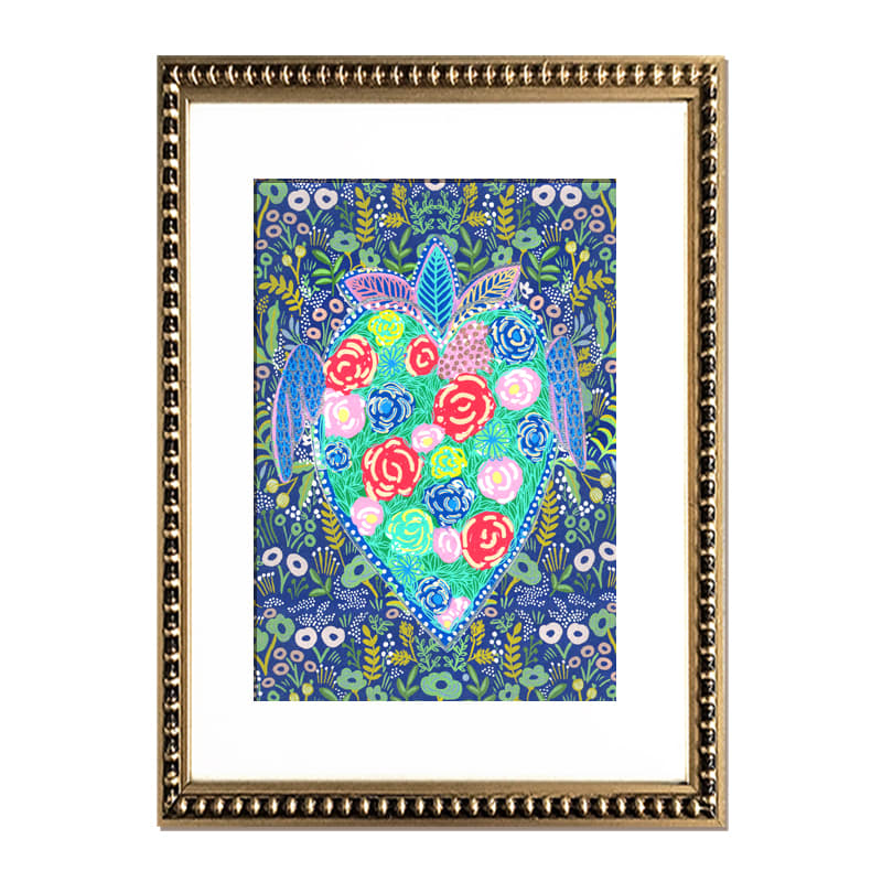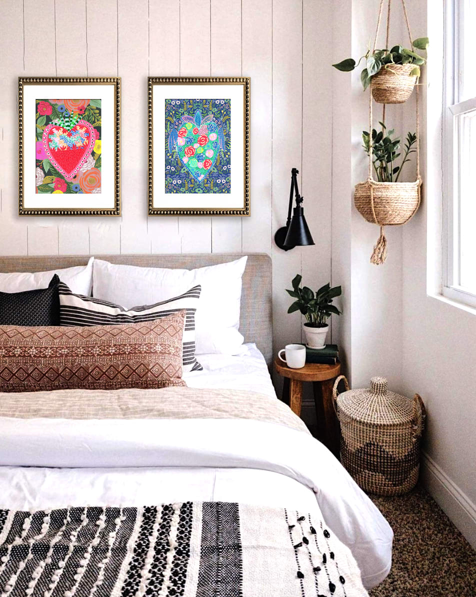 Pareja de 2 cuadros con diseños de corazón, paspartú blanco y marco de madera con perlas color dorado.
