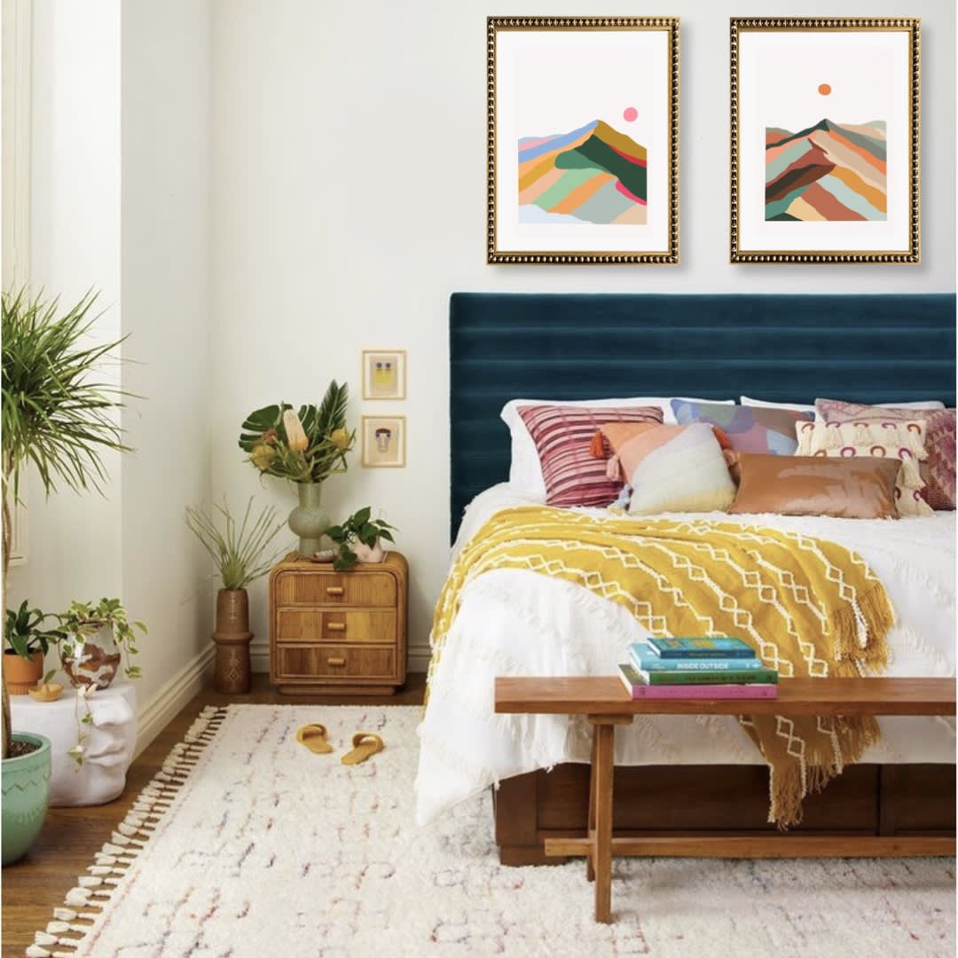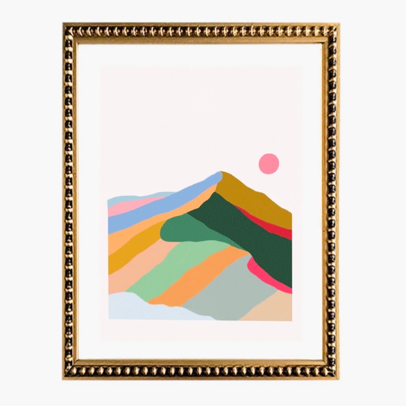 Pareja de 2 cuadros de cerros en colores, paspartú blanco, vidrio y marco de madera color dorado con perlas envejecido.