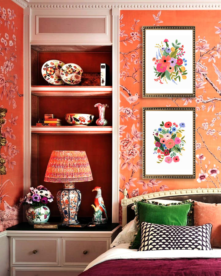 Dos cuadros de flores en colores, con paspartú blanco y marco de madera dorado con perlas.