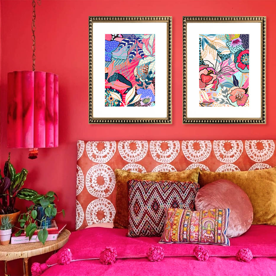 Pareja de 2 cuadros con diseños de flores print, paspartú blanco y marco de madera con perlas dorado.