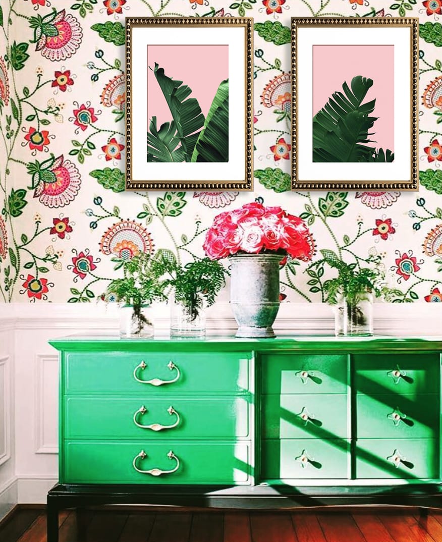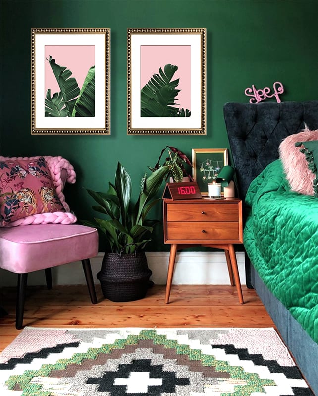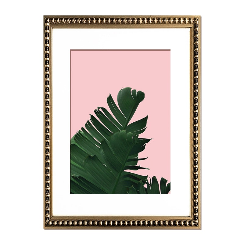 Pack de 2 cuadros de hojas de banano con fondo rosa, paspartú blanco y marco perla oro delgado.
