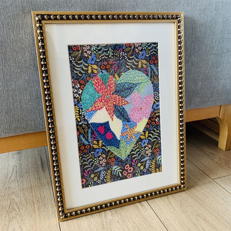 Cuadro de lámina de corazon con mini corazones en fondo de flores, paspartú blanco y marco perla oro.