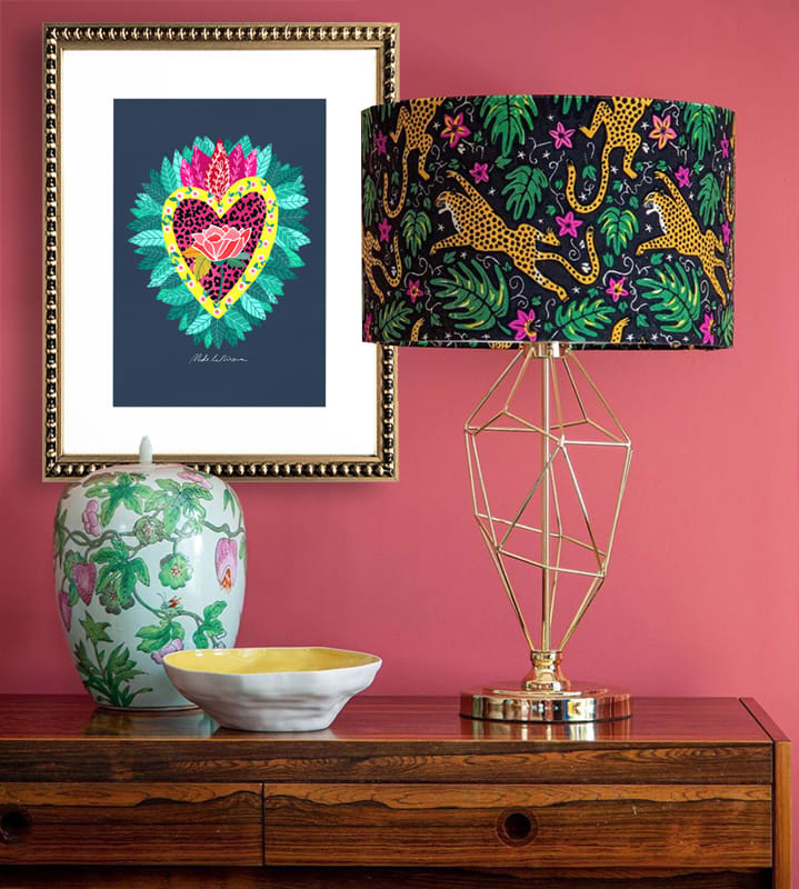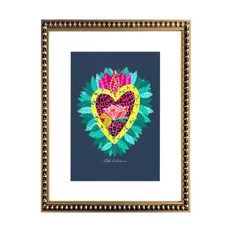 Cuadro de corazón en colores, con paspartú blanco en marco de madera con perlas dorado.