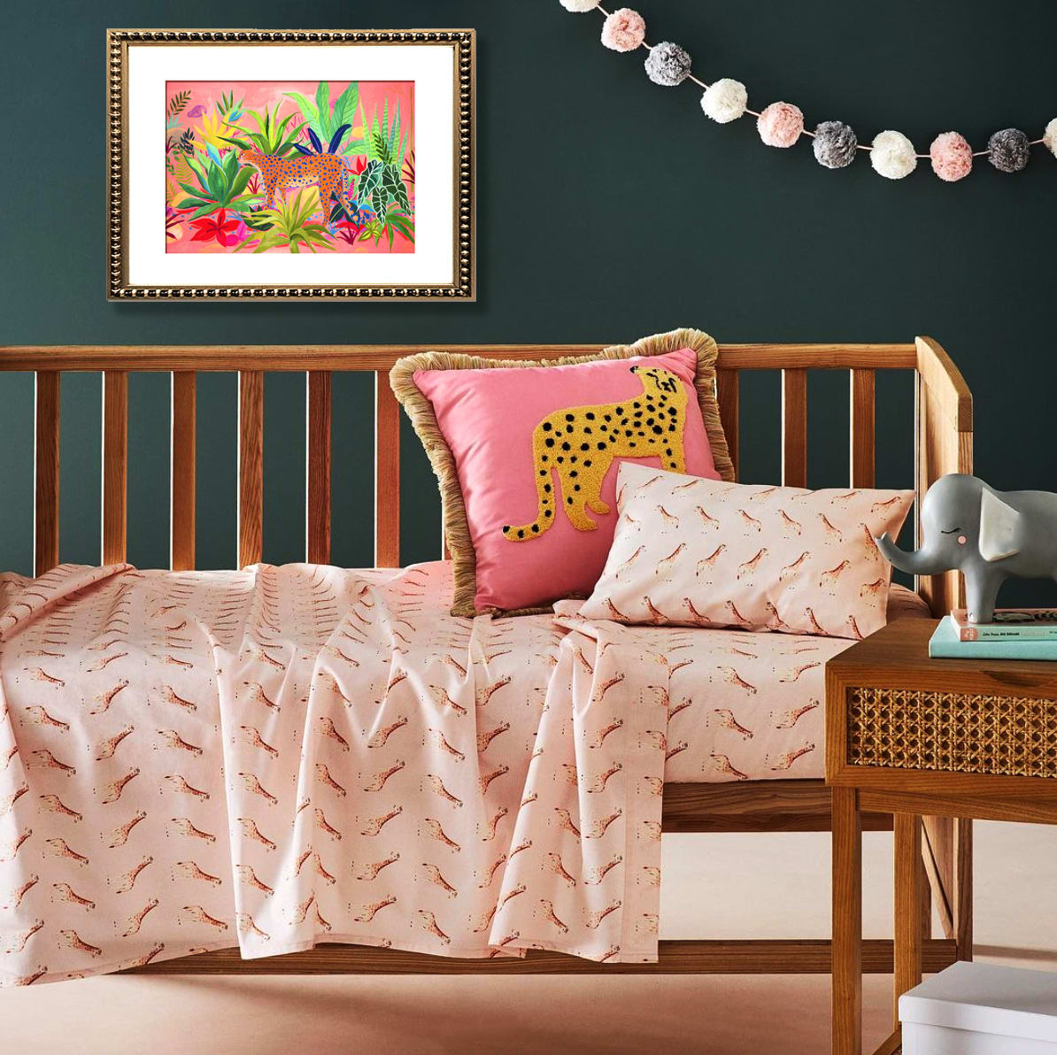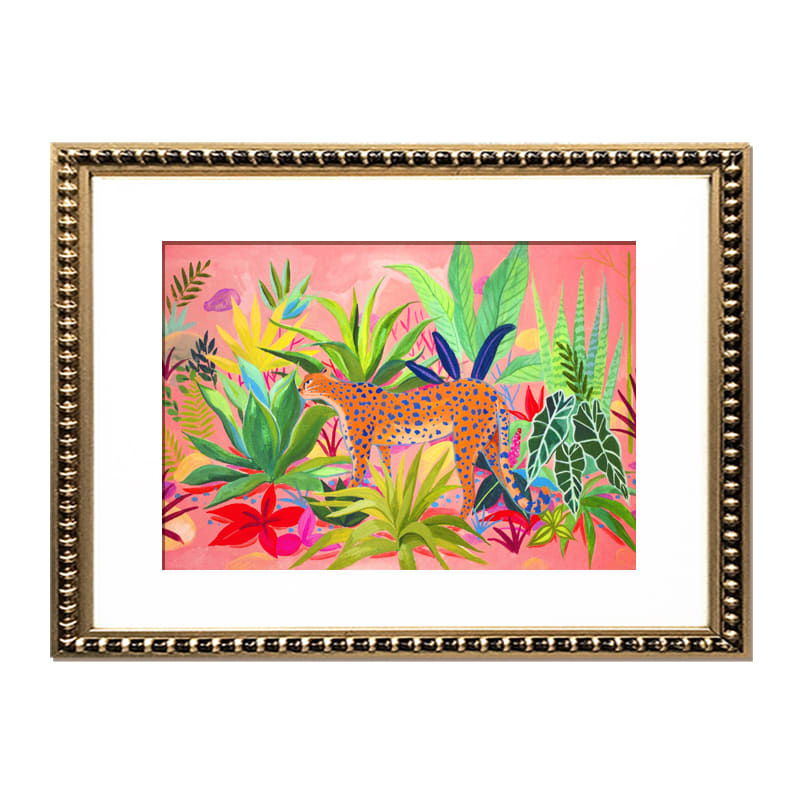 Cuadro de leopardo en selva, con paspartú blanco y marco de madera con perlas color dorado envejecido.