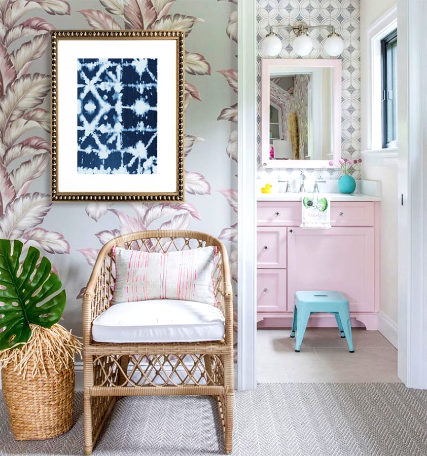 Cuadro de diseño shibori en azul y blanco, con paspartú blanco y marco de madera con perlas color dorado.