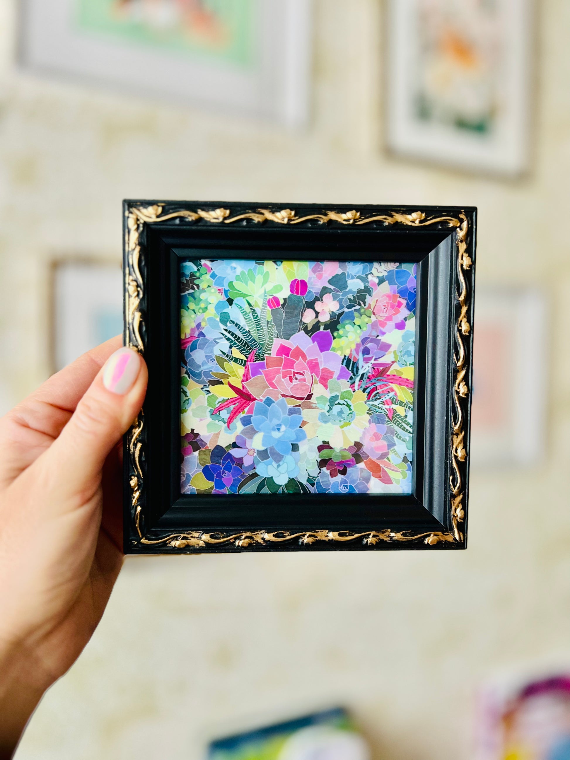 Mini cuadrito con diseño de suculentas en marco de madera negro con detalles dorados.