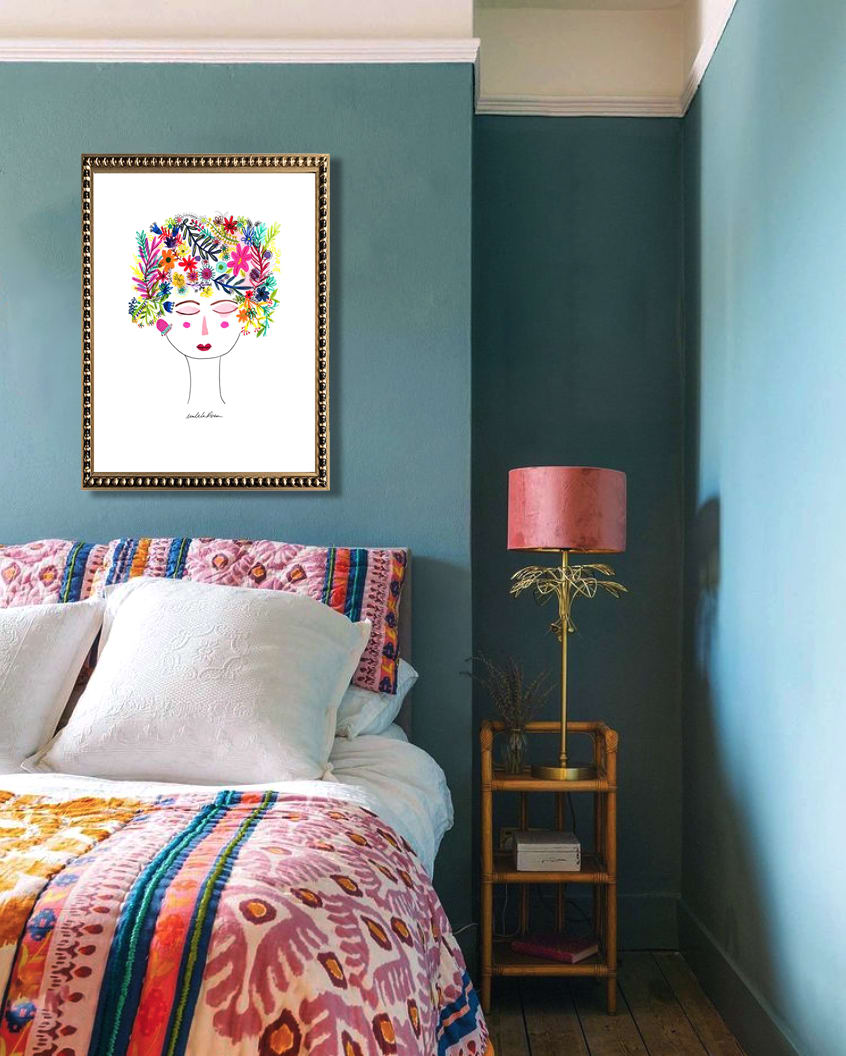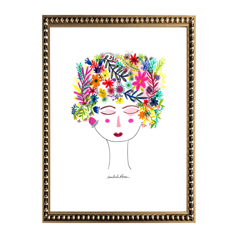 Reproducción de acuarela y tinta de mujer con sombrero de flores en marco de madera dorado con perlas.