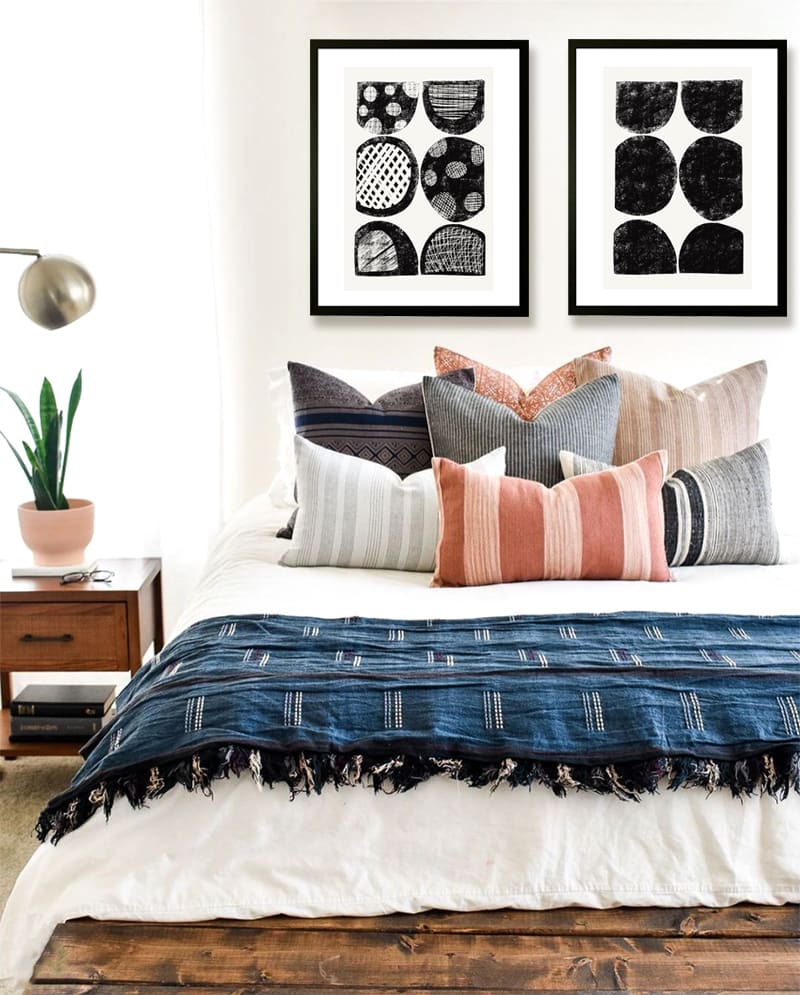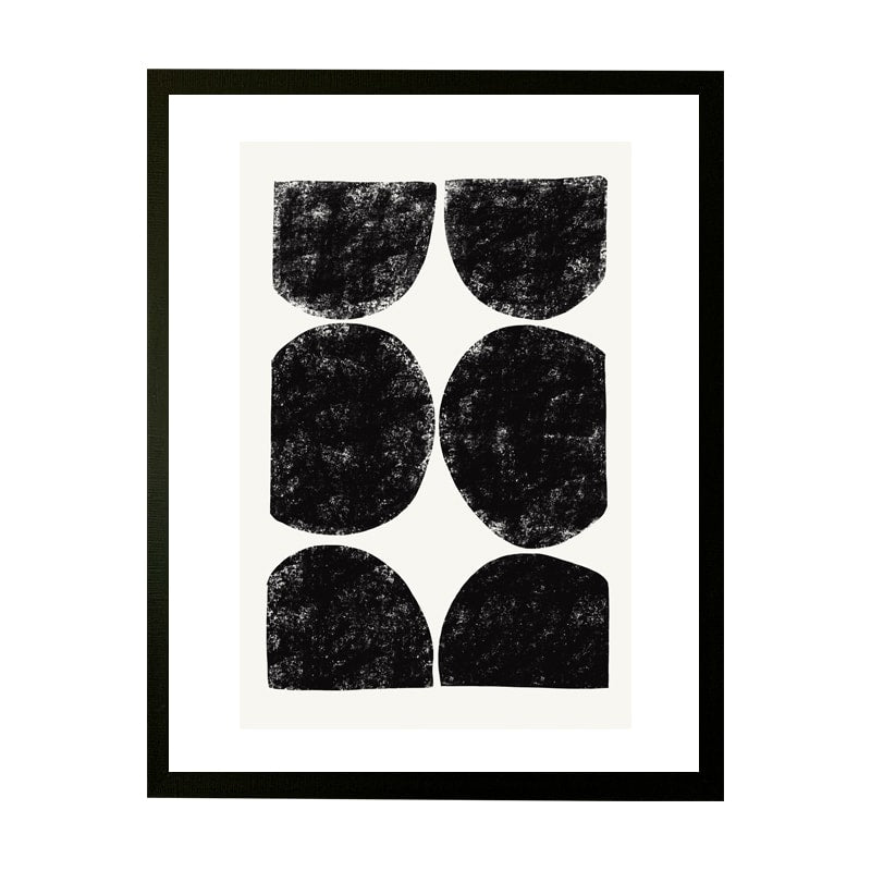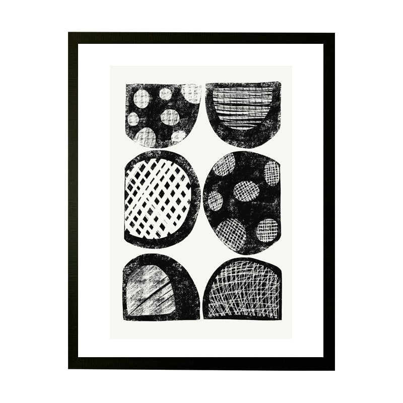 Pareja de cuadros de circulos en diferentes texturas y patrones, paspartú blanco y marco negro liso.