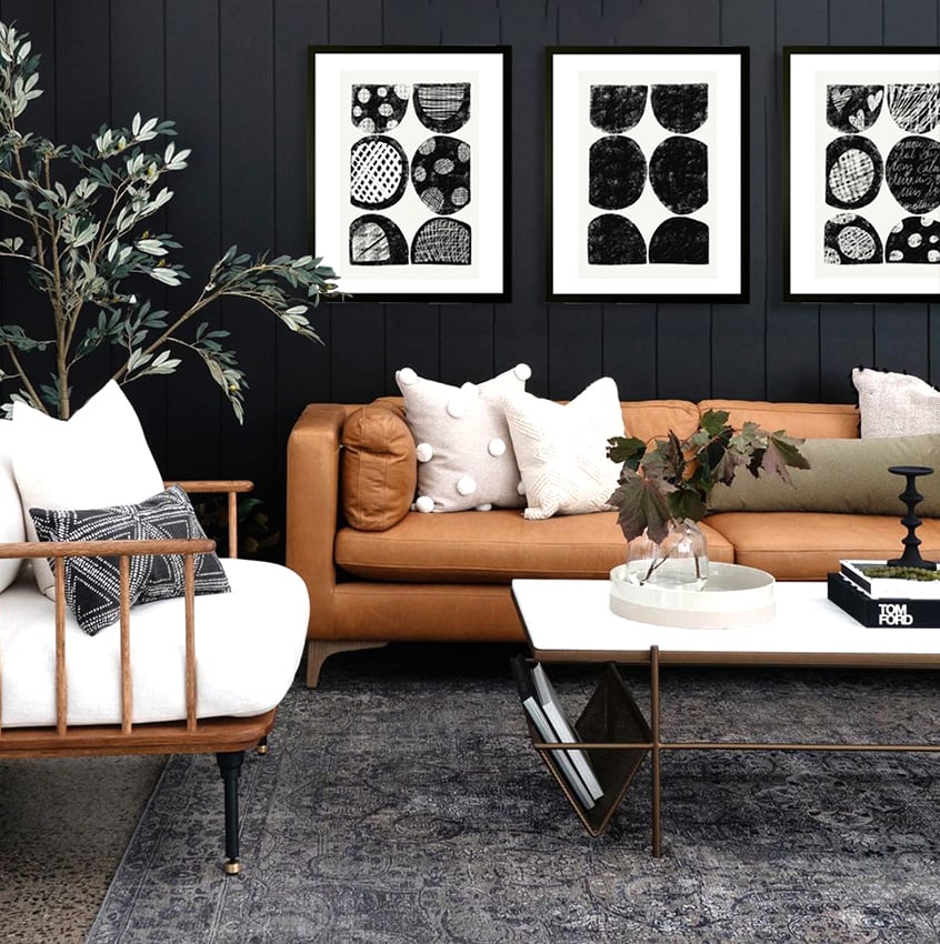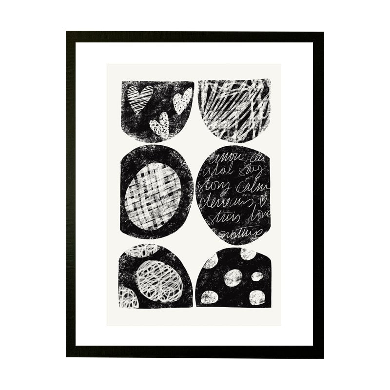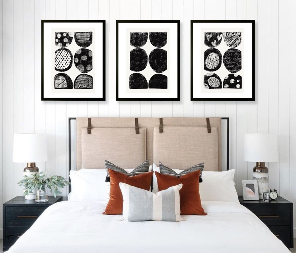 Pack de tres cuadros de círculos en diferentes texturas y patrones, paspartú blanco y marco negro liso.