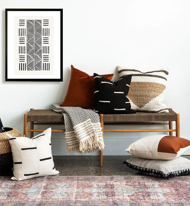Cuadro de lineas en diferentes texturas y patrones, paspartú blanco y marco negro liso.