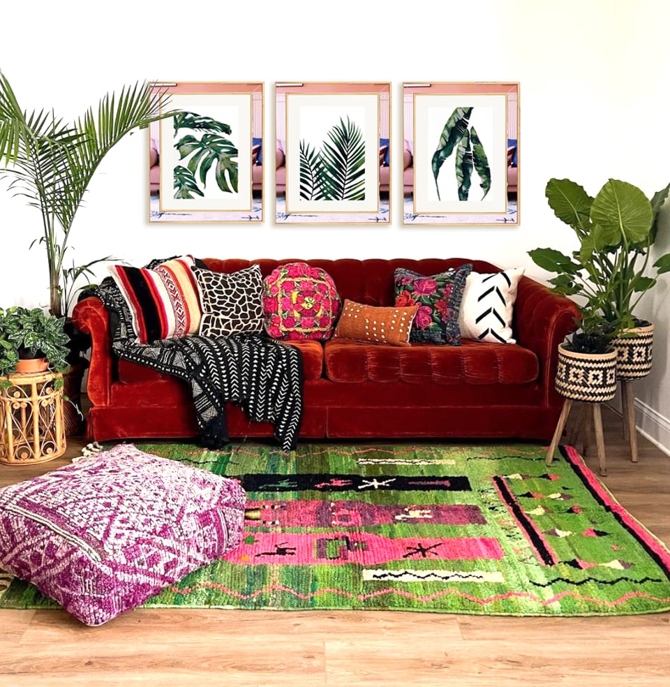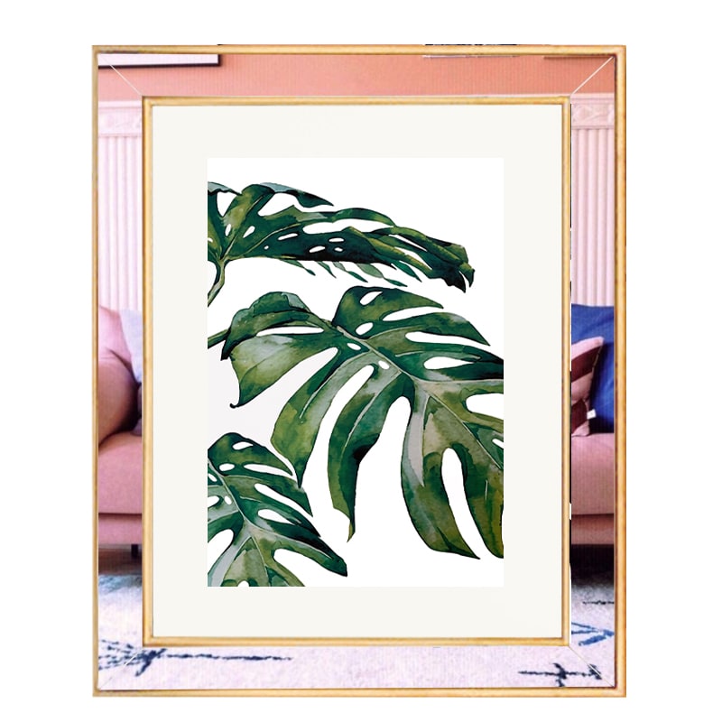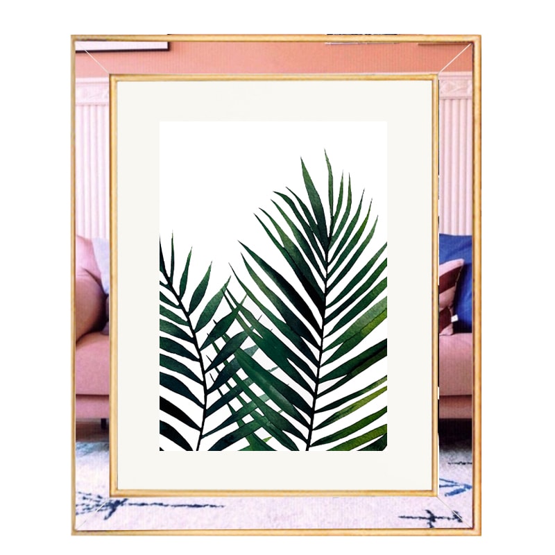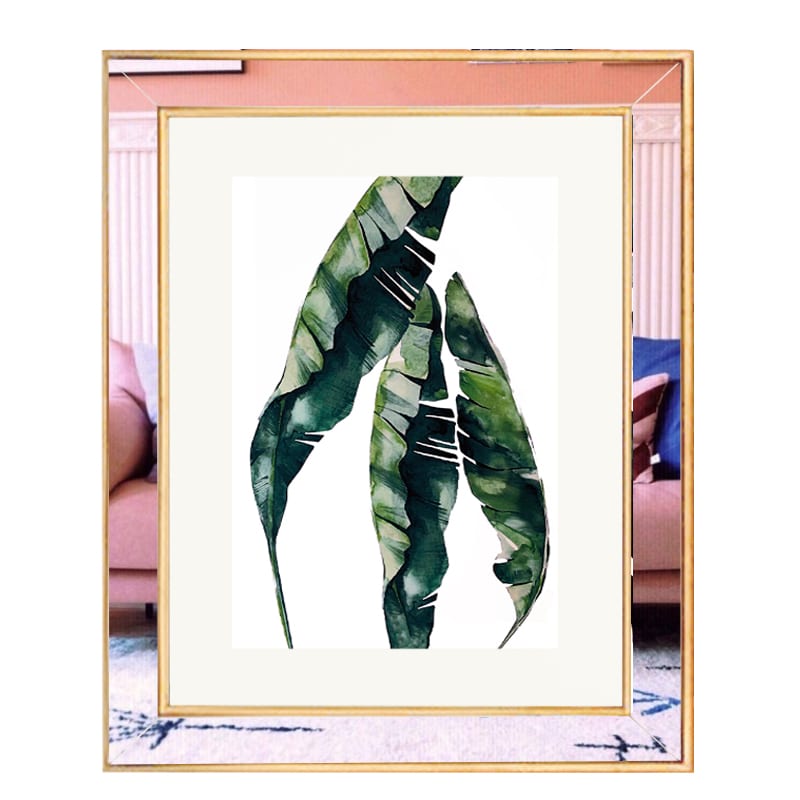 Tres cuadros en marco espejo y paspartú blanco, con diseños de hojas botánicas.
