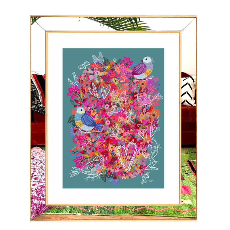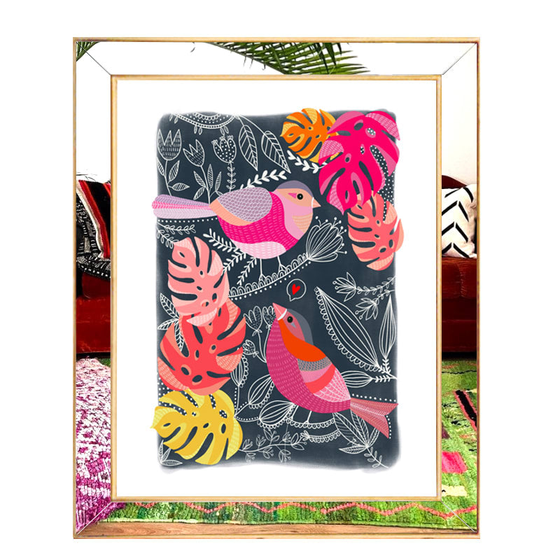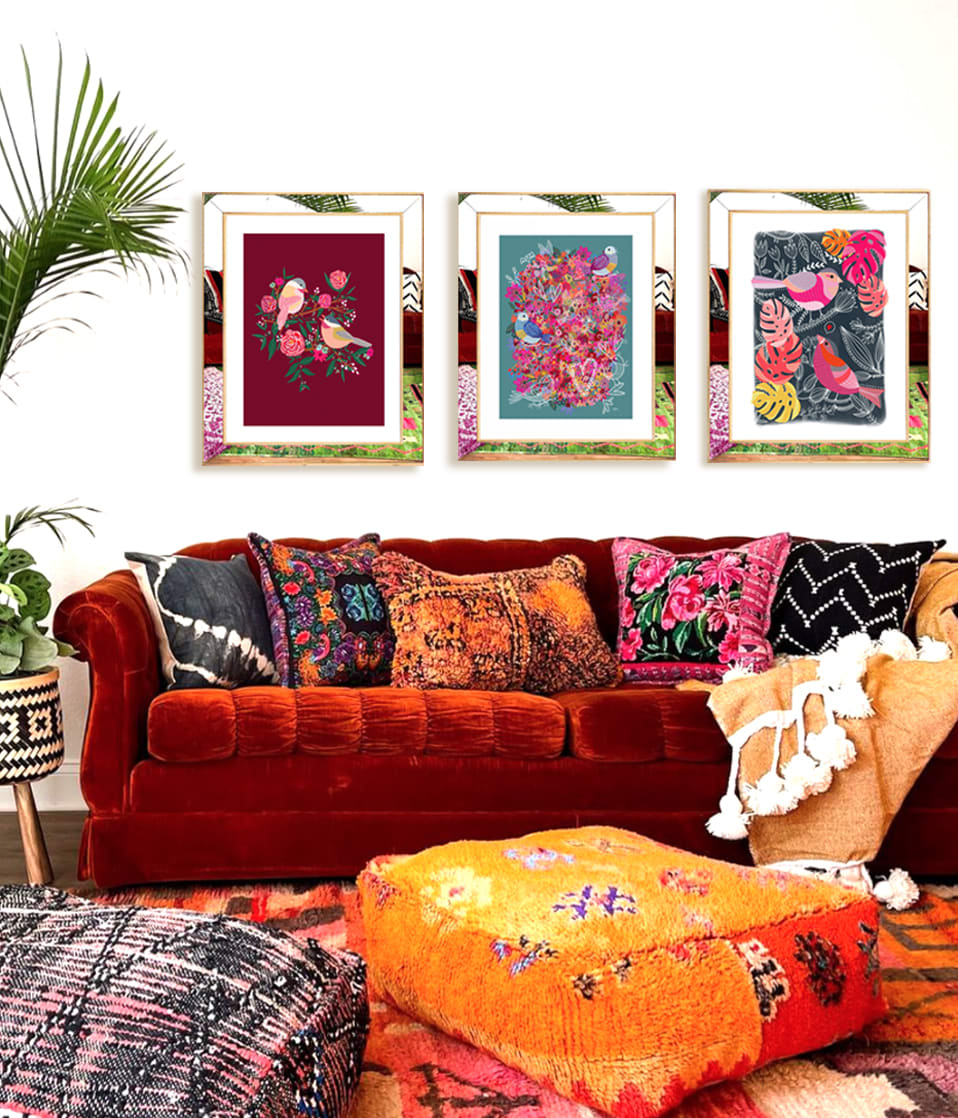 Pack de 3 cuadros con diseños de pajaritos, con paspartú blanco y marco espejo con borde dorado.