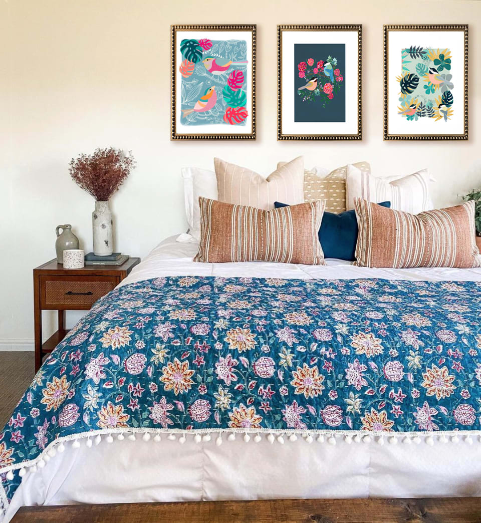 Tres cuadros de pajaritos en colores con paspartú blanco y marco de madera de perlas oro.