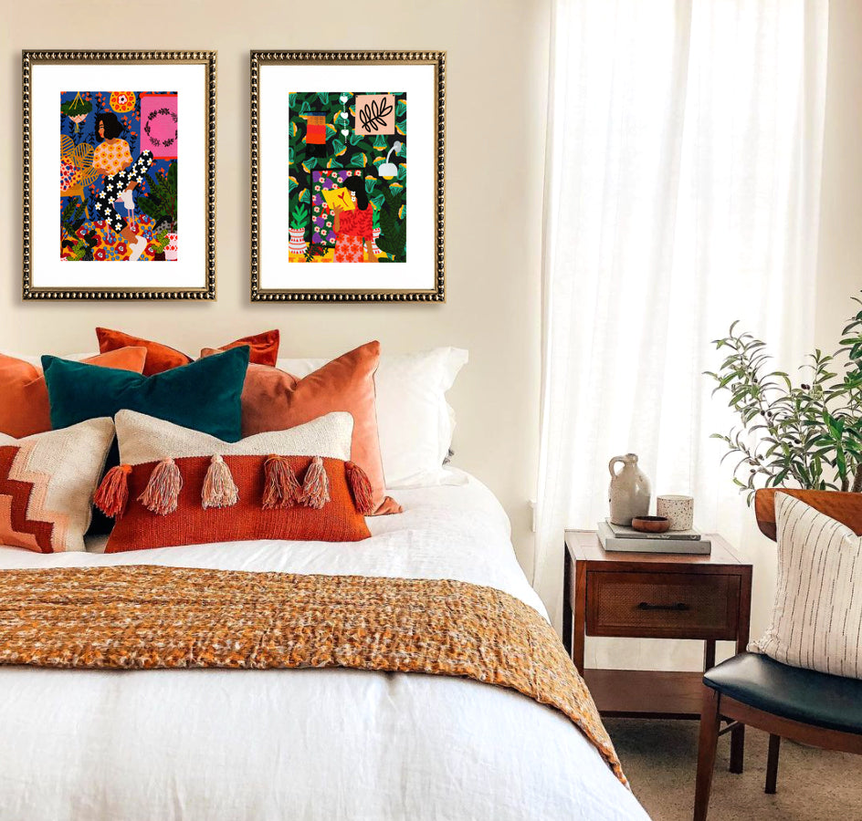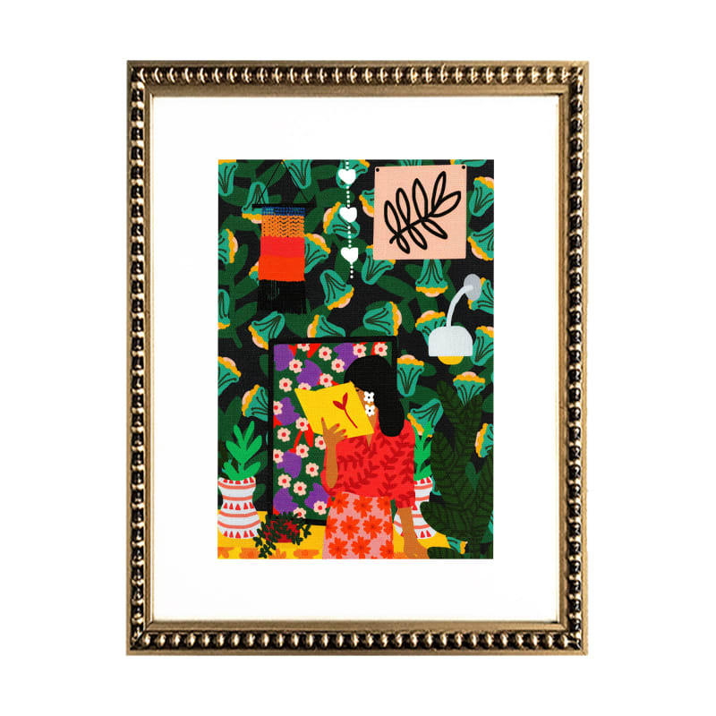 Cuadro de ilustración de mujer con libro, paspartú blanco y marco de madera con perlas dorado.