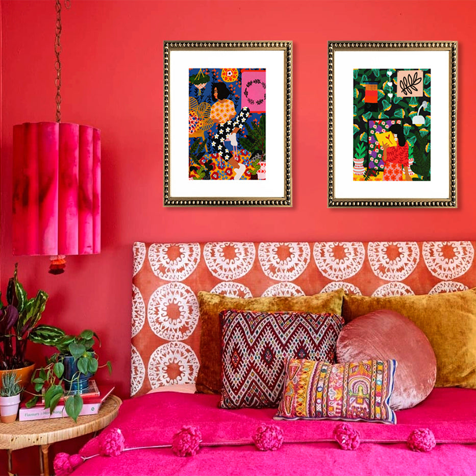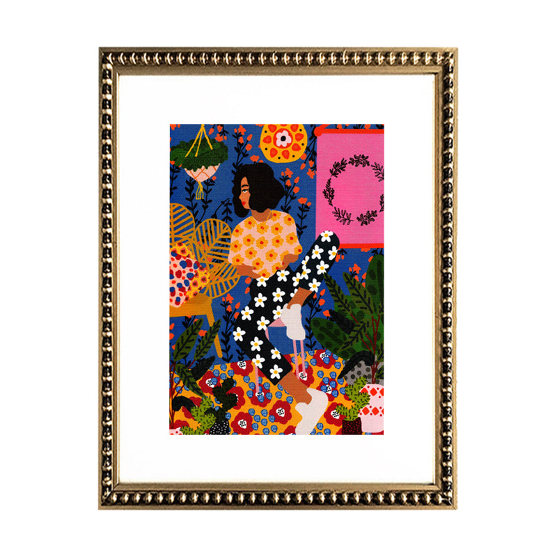 Cuadro de ilustración de mujer con libro, paspartú blanco y marco de madera con perlas dorado.