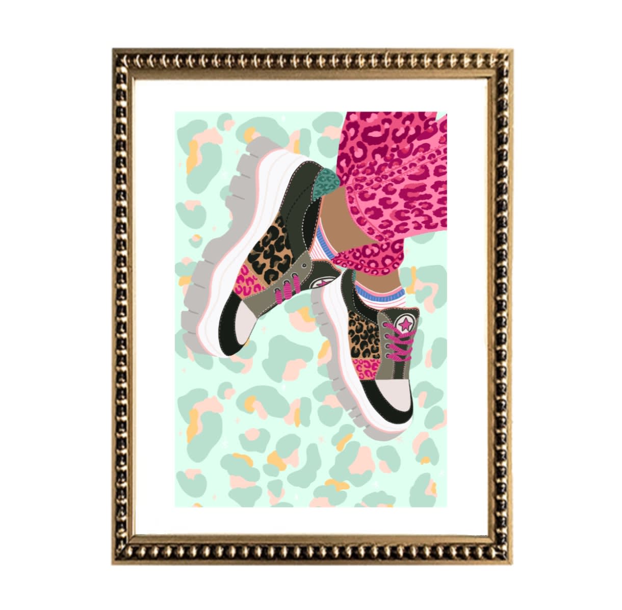 Cuadro de zapatillas en animal print con paspartú blanco y marco de madera con perlas doradas.