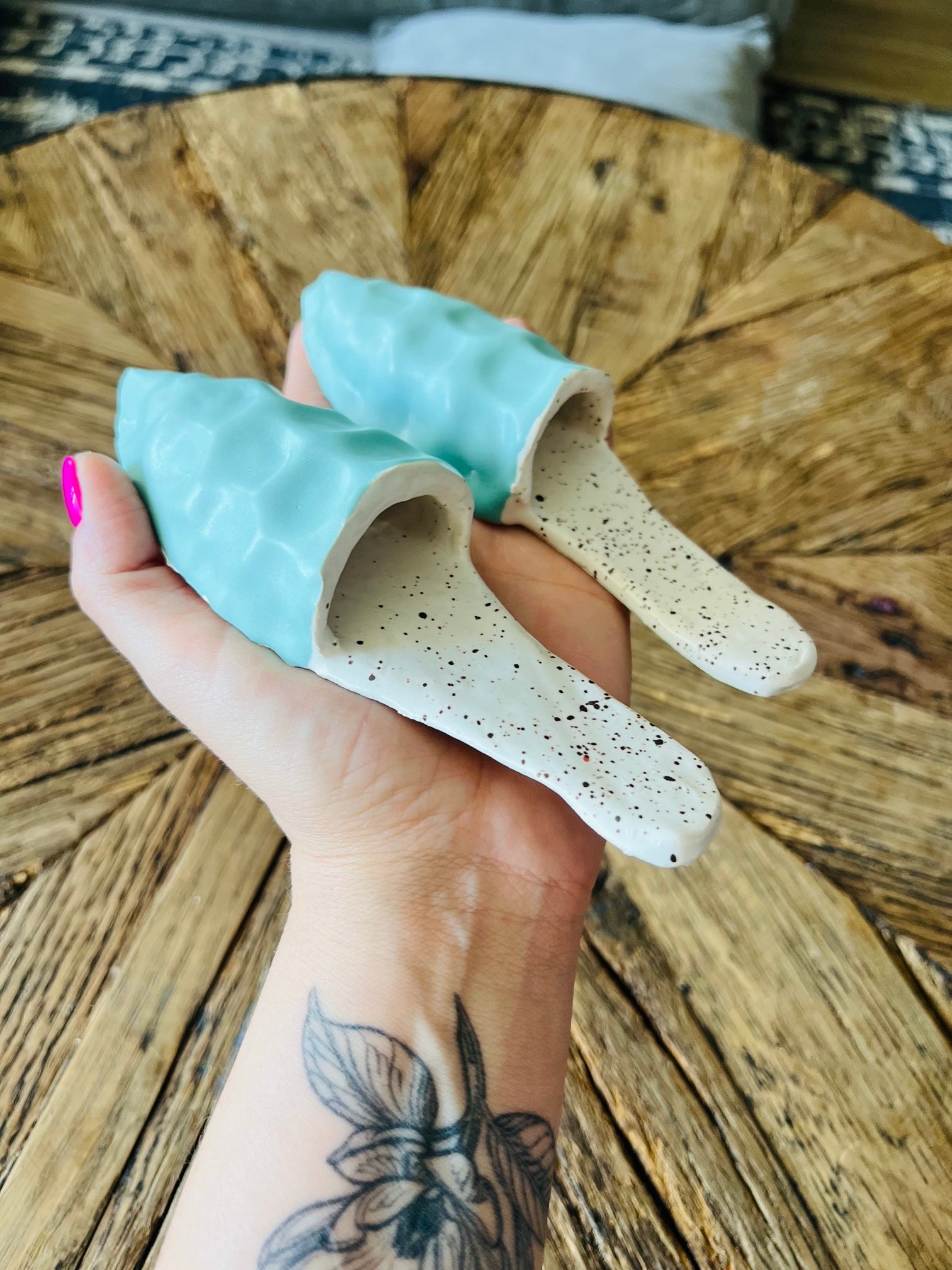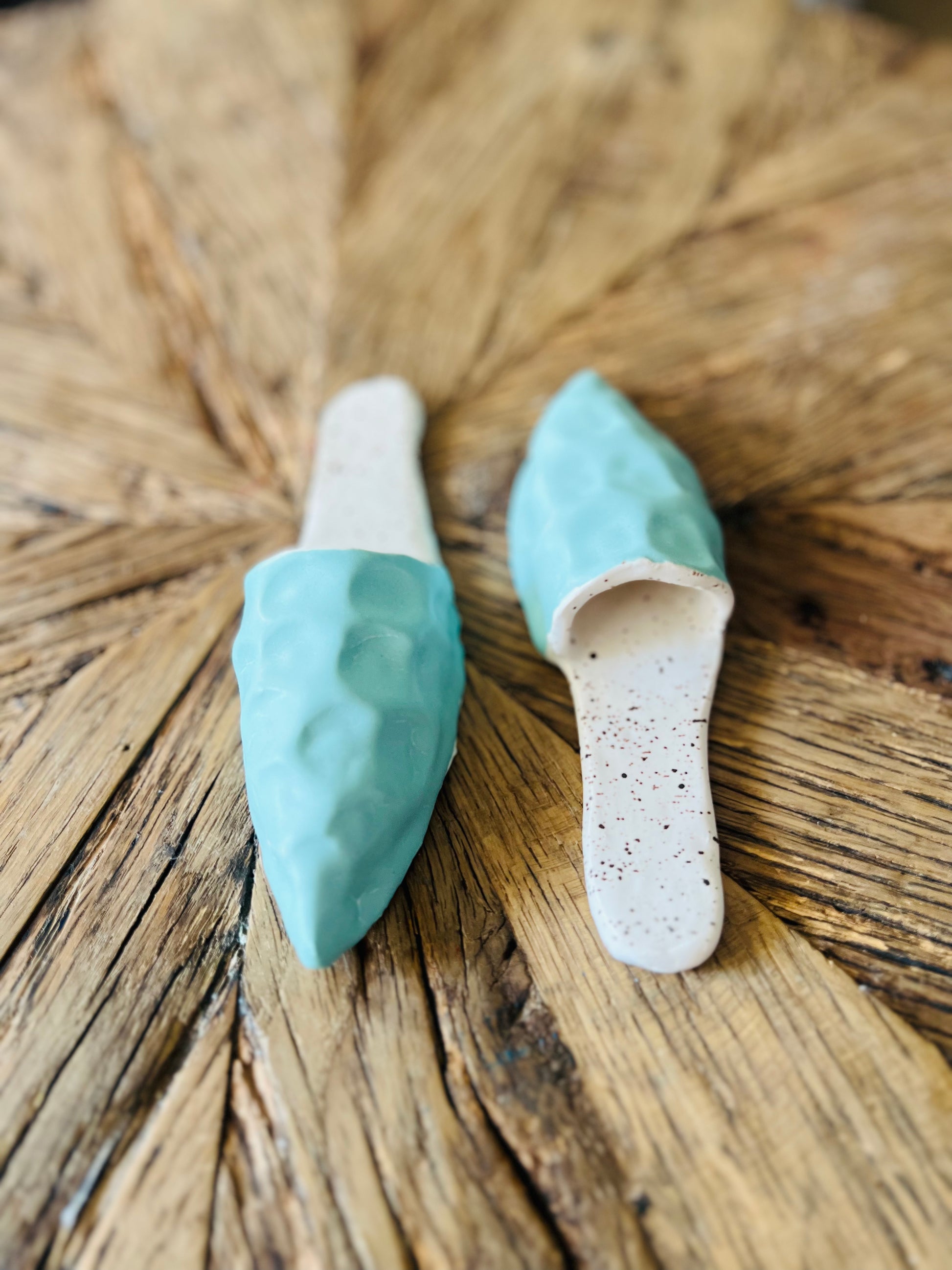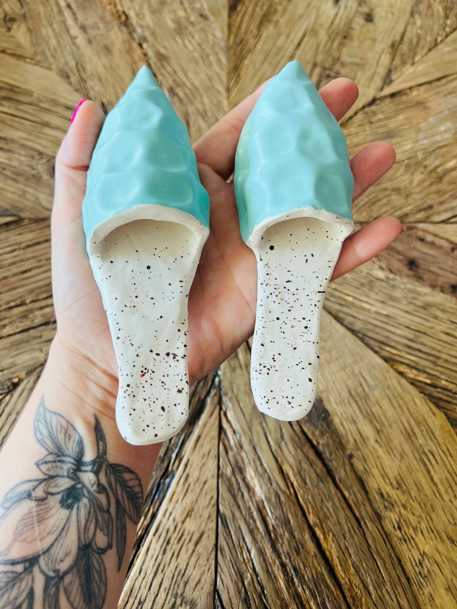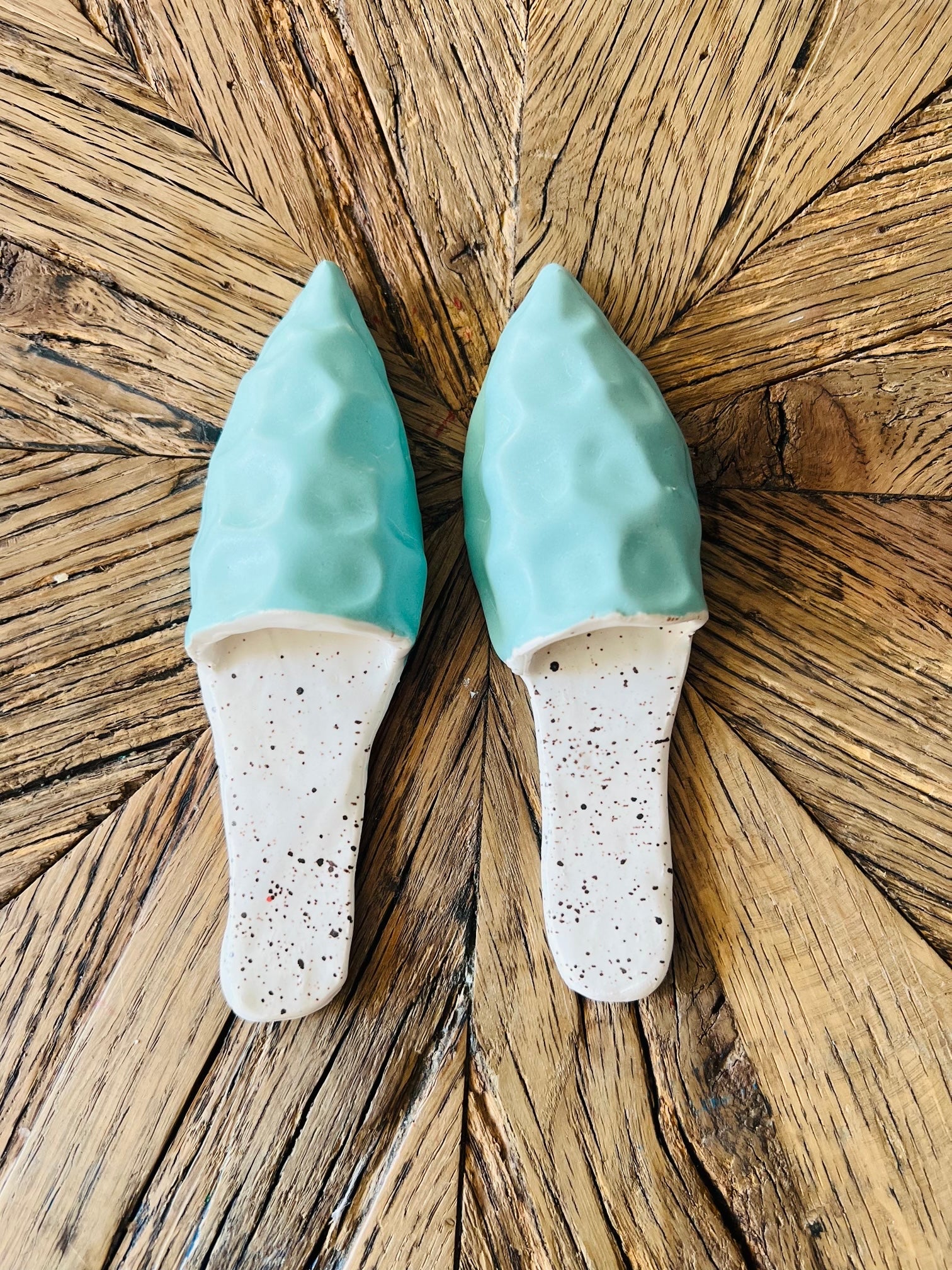 Par de zapatitos hechos a mano en cerámica gres y esmaltados en color turquesa con detalles de manganeso.
