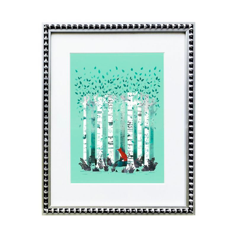 Cuadro reproducción de zorro en bosque blanco, paspartú blanco y marco perla plata delgado.